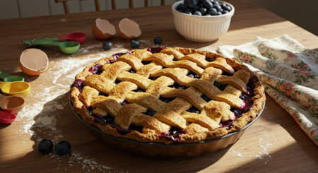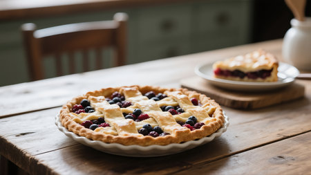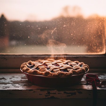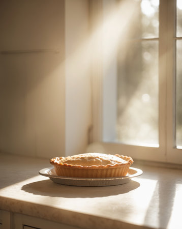 AI Generated. Warm kitchen counter with freshly baked pie and soft glowing sunlight