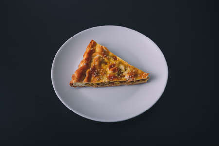 Piece of meat and carrot pie on white plate on black wooden background. Tasty healthy food. Diet, nutrition, eating habits concept. Place for text