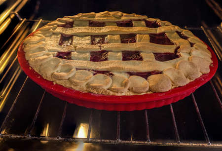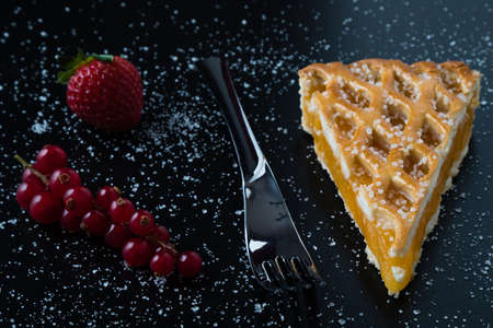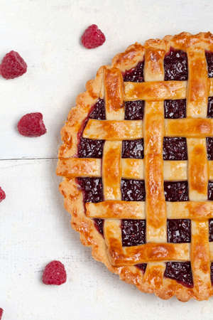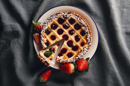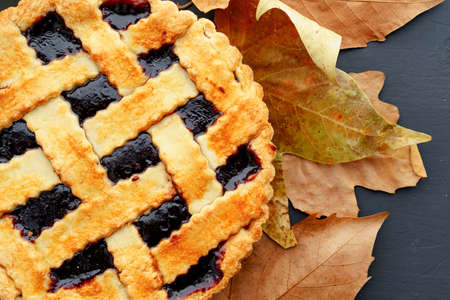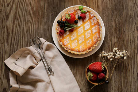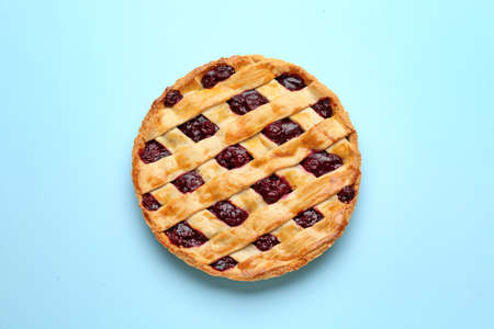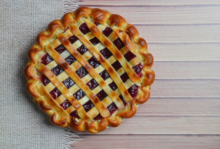 Homemade cherry pie with jam on wooden table background. Copy space is available.