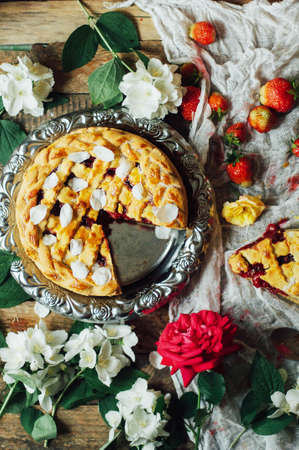 Homemade cherry and strawberry pie on rustic background. Delicious Homemade Cherry Pie with a Flaky Crust. Rustic dark style. decorated with roses and jasmine flowers. Dessert for the family