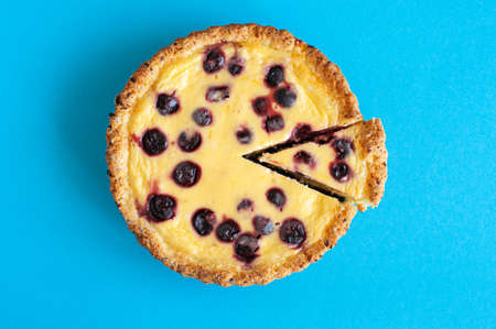 Lemon pie sliced on a blue background. Sliced lemon tart. Delicious sweet food.