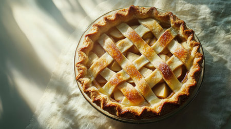 A beautiful golden lattice apple pie, freshly baked and placed in natural light, showcasing its delicious and inviting appearance. Perfect for any occasion.