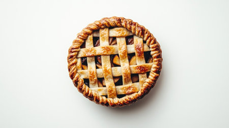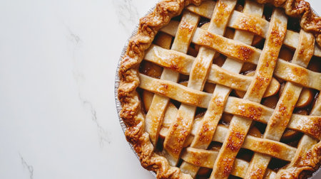 A beautiful close-up shot of a golden lattice apple pie. The intricate crust showcases a mouthwatering filling, making it an inviting dessert for any occasion.