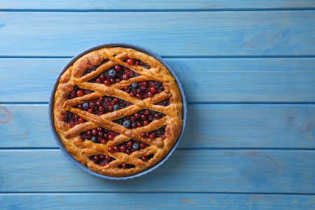 Delicious currant pie and fresh berries on blue wooden table, top view. Space for text