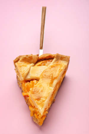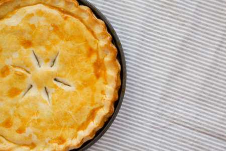 A Piece of Chicken Pot Pie, top view. Flat lay, overhead, from above. Space for text.