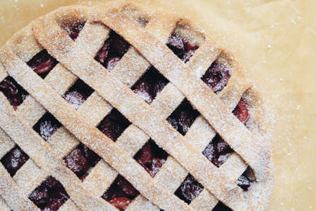 Homemade summer cherry pie filled with fresh berries on white background with powdered sugar on top, close up. Lattice pie crust.