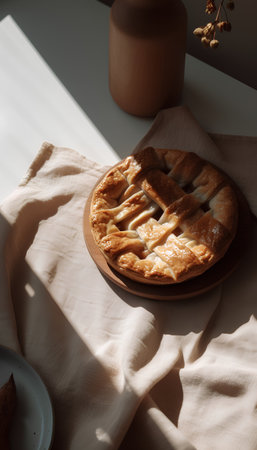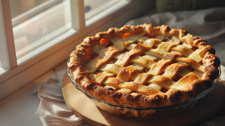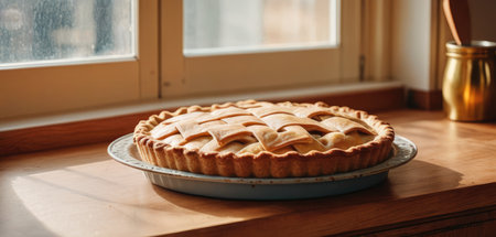 Freshly Baked Lattice Apple Pie on a Wooden Board by a Sunlit Window