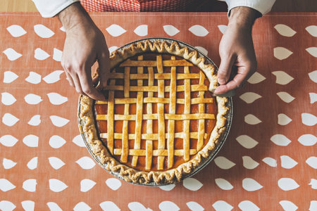 Celebratory thanksgiving pie freshly baked by smiling chef.