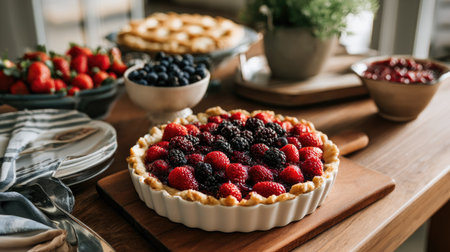 A beautiful fruit tart adorned with fresh raspberries, blackberries, and blueberries placed on a rustic wooden table, surrounded by bowls of assorted berries, perfect for summer gatherings.