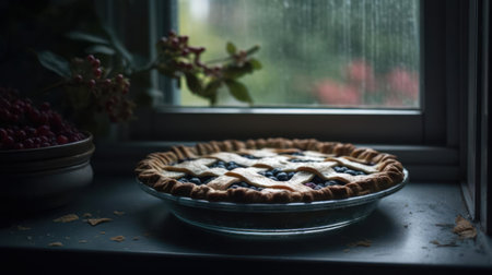 A homemade blueberry pie cooling on a windowsill created with Generative AI