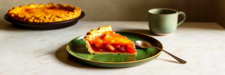 A slice of freshly baked fruit pie rests on a decorative plate, complemented by a spoon, with a whole pie and a coffee cup visible in a bright kitchen, banner