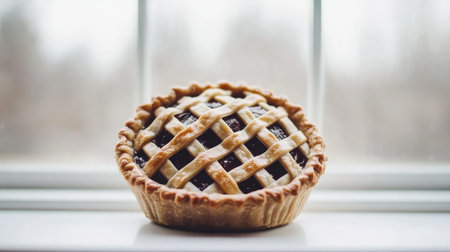 A single pie cooling on a windowsill with lattice crust and golden baked edges