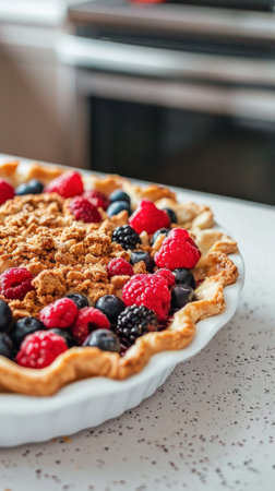 Mixed Berry Pie with Crumbly Topping in Modern Kitchen Setting. Concept of Homemade Desserts, Fresh Berries, Delicious Baking, Comfort Food. Vertical.