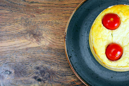 Beautiful tasty pies lie on a plate on a wooden table in a classic rustic kitchen.