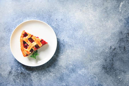 Piece of cherry pie from filo dough on rustic metal tray on light background. Top view