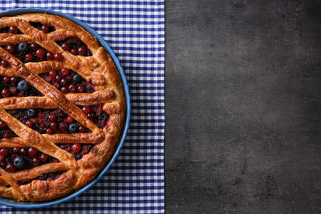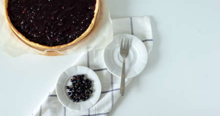 Sweet cake with black currant. Homemade pie with summer berries on a white table. top view from above. Tasty baked sweets.