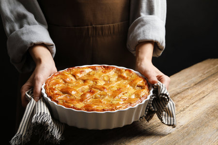 Woman with baking dish of delicious homemade apple pie at wooden table against black background, closeup