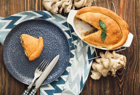 Baking dish and plate with tasty mushroom pot pie on wooden background