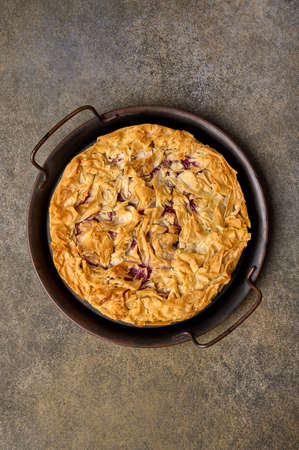 Homemade cherry pie or tart from filo dough. Top view. Vertical orientation