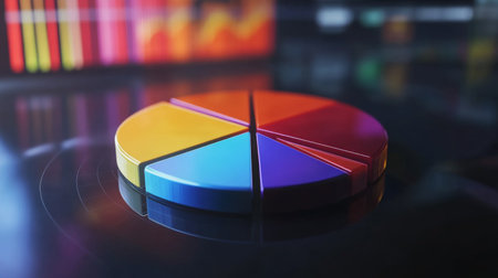 Colorful D pie chart with translucent segments, placed on a dark, reflective surface with soft lighting, symbolizing data visualization