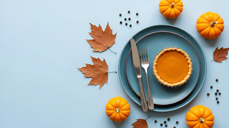 A Thanksgiving table setting featuring a pumpkin pie on a blue plate with a fork and knife. Mini pumpkins, dried maple leaves, and peppercorns are scattered around the plate on a light blue background. The composition is arranged in a flat lay style, emphasizing the autumnal theme.
