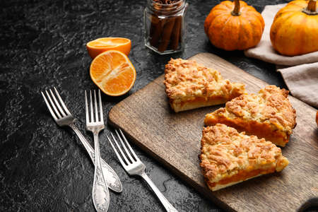 Wooden board with pieces of tasty pumpkin pie on black background