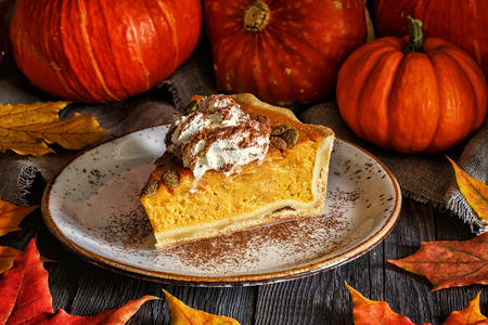 Traditional autumn pumpkin pie on the plate close-up. Thanksgiving dessert.