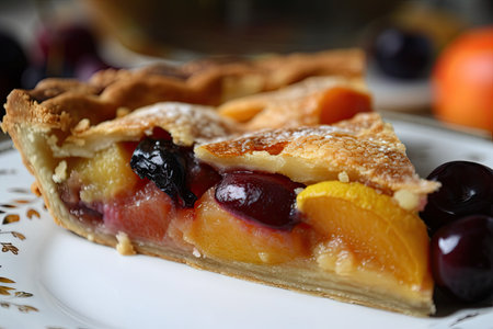 close-up of slice of fruit pie, with juicy fruits and flaky crust visible, created with generative ai