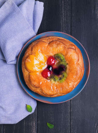 Homemade flan decorated with fruits. Colorful, beautiful decoration.
