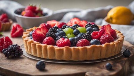 A delectable berry tart showcasing fresh strawberries, blueberries, and blackberries, beautifully arranged on a rustic wooden table, perfect for summer gatherings.