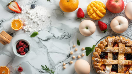 A still life photography featuring a table adorned with bowls of fruit, eggs, flour, and a pie. This composition showcases the ingredients for a delicious recipe AIG50