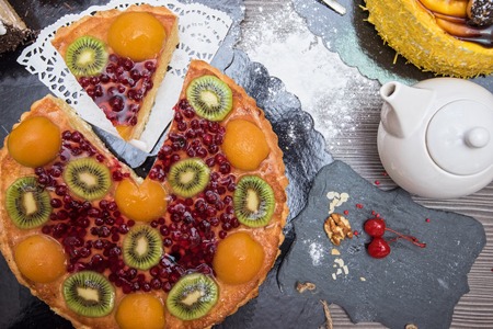 Fruit tart with strawberries, blueberries, kiwi and apricots