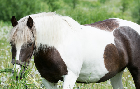 young spotted horse grazes in a meadows
