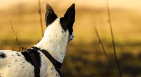 Basenji dog on a background of branches looks into the distance in yellow fiels, banner photo