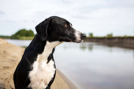 Black and white dog breed pointer. The dog sits on the sandy Bank of the river and looks away.