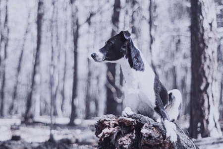 Creative portrait of a dog sitting on a tree. Sunny woodland in spring, young doggy with black head posing on a rotten trunk. Selective focus on the details, blurred background.