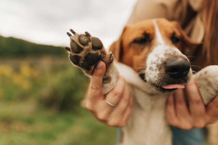 close-up of a dog's paws Jack Russell Terrier on the hands of his owner. Pets