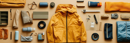 Essential equipment for camping and hiking including an orange down jacket, sleeping bags, and other accessories arranged on a gray background