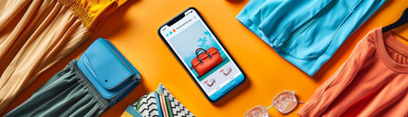 Smartphone with colorful background, fabric and coins.
