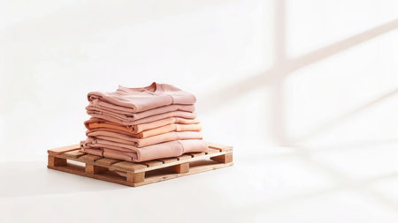 A stack of neatly folded spring clothing items rests in a corner of a studio. The neutral background offers a clean space for design purposes.