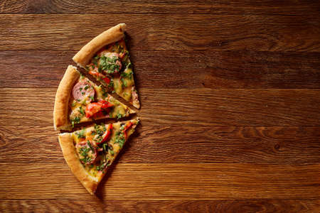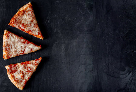 Three slices of freshly baked delicious pizza on rustic wooden background, top view, close-up, selective focus. Some copy space for your text. Delicious snack. Yummy junk food. Traditional Italian pizza. Mediterranian cuisine. Fast food concept.
