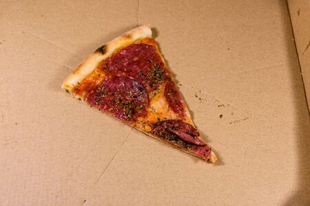 Last piece of pizza with salami sausage and parmesan cheese in cardboard box