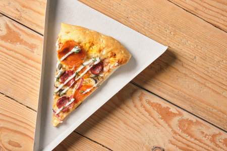 Bitten slice of pizza in cardboard box on a wooden table. Top view. Concept for home delivery of food, fast food, delivery of pizza
