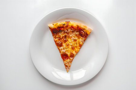 A single slice of pizza on a white plate. It looks delicious and appetizing.