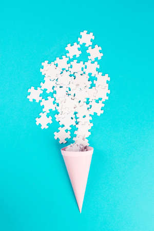 Cone with white puzzle pieces, blue background, spreading the jigsaw parts, searching for ideas and solutions, brainstorming as a team, flat lay