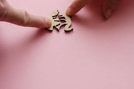 Adult Male and Female Assemble Wooden Puzzle with Pink Background. Puzzle pieces in the shape of animals and other complex shapes. Active leisure. Board games to develop logical thinking.