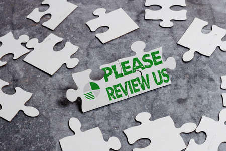 Handwriting text Please Review Us. Business overview situation or system is formal examination by showing authority Building An Unfinished White Jigsaw Pattern Puzzle With Missing Last Piece