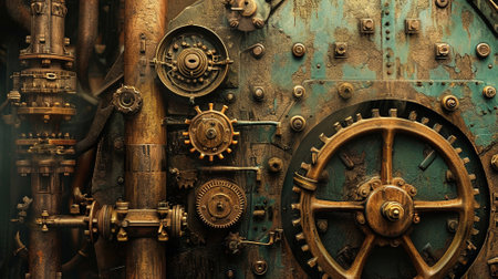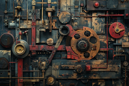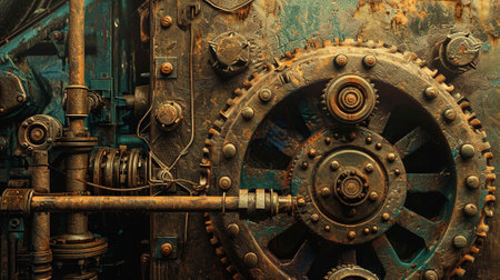 A detailed depiction of a vintage industrial machine showcasing intricate gears and belts with a rusty metal finish. Ideal for design and engineering themes.