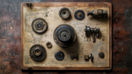 A meticulously arranged collection of vintage mechanical parts sits atop an old blueprint. The gears, cogs, and components showcase detailed craftsmanship and engineering artistry, creating a compelling visual narrative.