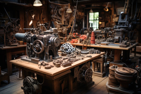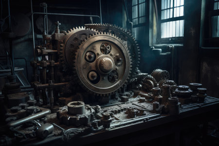 Old machinery reveals intricate gears and weathered metal in a forgotten workshop bathed in soft light